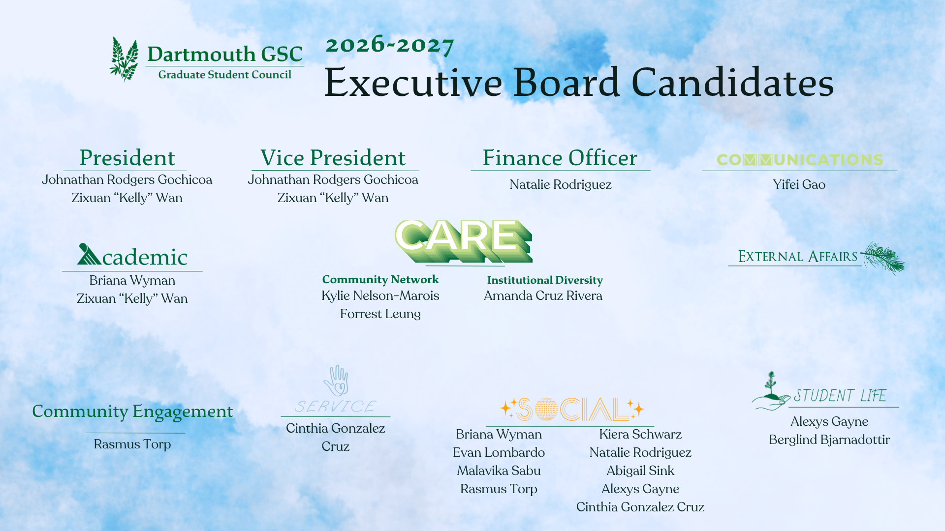 The Executive Board is responsible for facilitating initiatives, meeting with Dartmouth administration and leading GSC departmental representatives. You do not need to be a current (or past) GSC member to apply. If you have any specific questions about the positions, please feel free to email any current Executive Board member.